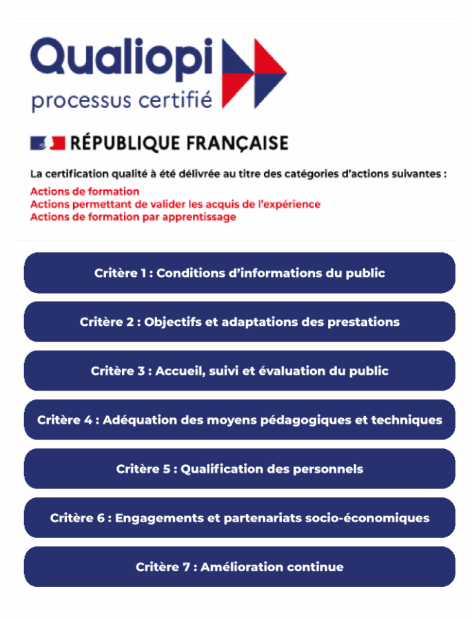 La certification QUALIOPI permet d’attester du respect des 7 critères ci-après :